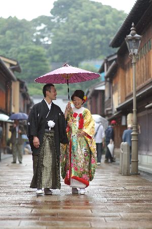 金沢らしさある抒情的な街並みで、自然な笑顔のショットです。