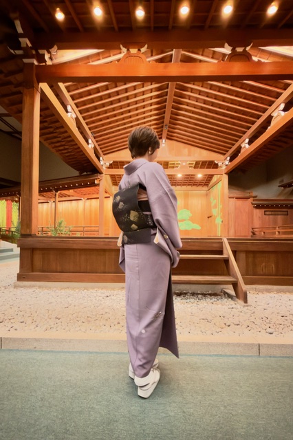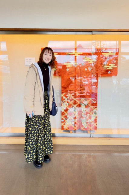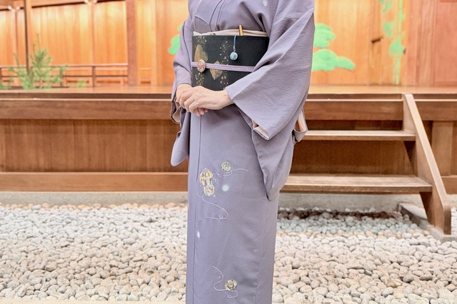 私、手毬柄の刺繍のお着物に金澤祝言花手毬の