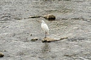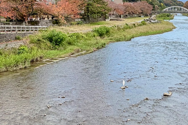 っと、スマホを掲げたところ川の真ん中に大きな白鷺さま発見です。