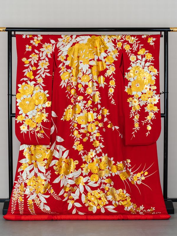 宝華唐草 本⼿描友禅 朱⾚濃淡花々