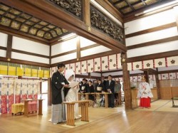 和・漢・洋折衷様式のギヤマンをあしらった 美しい神門がある尾山神社で挙式された お二人は、「利家とまつ」に憧れて尾山神社を お選びになられました。 明治6年に、歴代の加賀藩主が住んでいた 旧金谷御殿跡地に建てられた尾山神社の 御祭神は初代加賀藩主の前田利家公とおまつの方です。 おまつの方の存在がなければ、 前田家加賀百万石の繁栄はなかったと 言われており「何から何までわたくしにお任せくださりませ」と 学問や武芸に通じた女性であったおまつ方の 内助の功は今も語り継がれています。 秋晴れの優しい日射しの中で ロケーションフォトも楽しまれました。