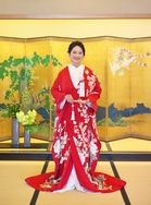 花嫁のれん前でお打掛の裾をおろしての