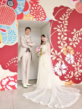 タレルの部屋では真四角の画用紙に 「青い空に白い雲」を描いたようです。 光を感じる爽やかなロケーションフォトとなりました。 ブーケはご結婚を祝ってお知り合いの方が 麻智さんのイメージで作ってくださった優しいピンクです。 加賀友禅の花柄の壁で、マリアベールを 纏われた雰囲気あるお写真も撮影。 エンパイヤラインのドレスは、ナチュラル感いっぱいで 自然体の花嫁様が誕生されました。